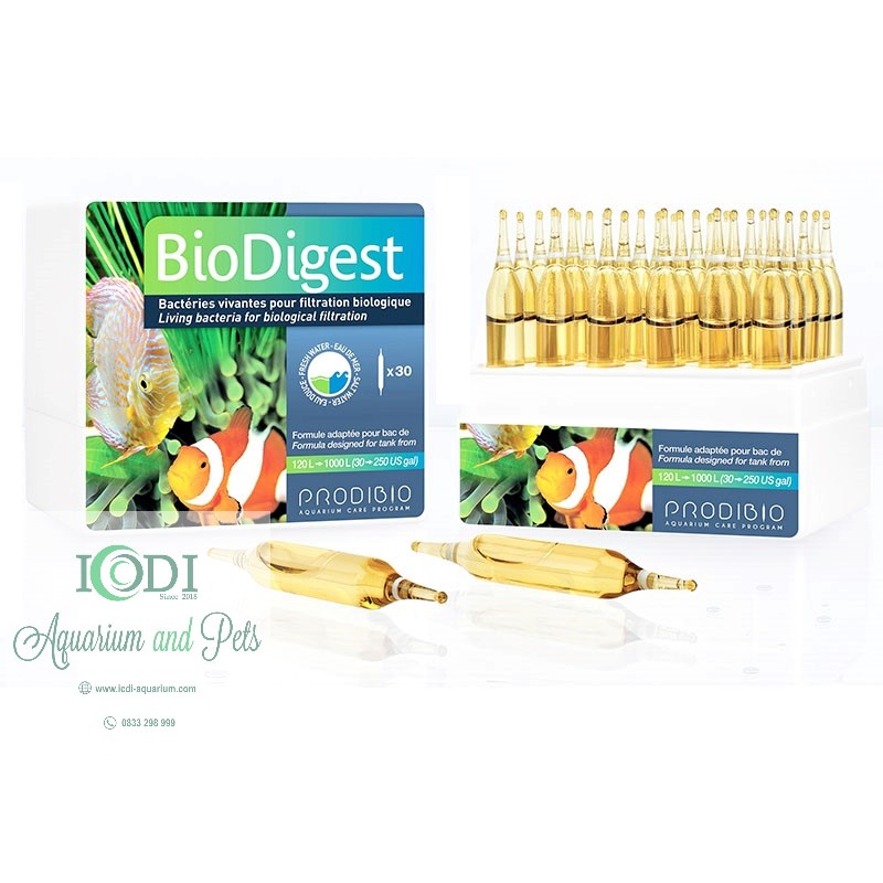 - Vi Sinh Cho Bể Cá PRODIBIO BioDigest có hiệu quả trong cả bể nước ngọt và nước biển và là một giải pháp vi khuẩn tập trung giúp lọc sinh học và loại bỏ chất thải hồ cá.